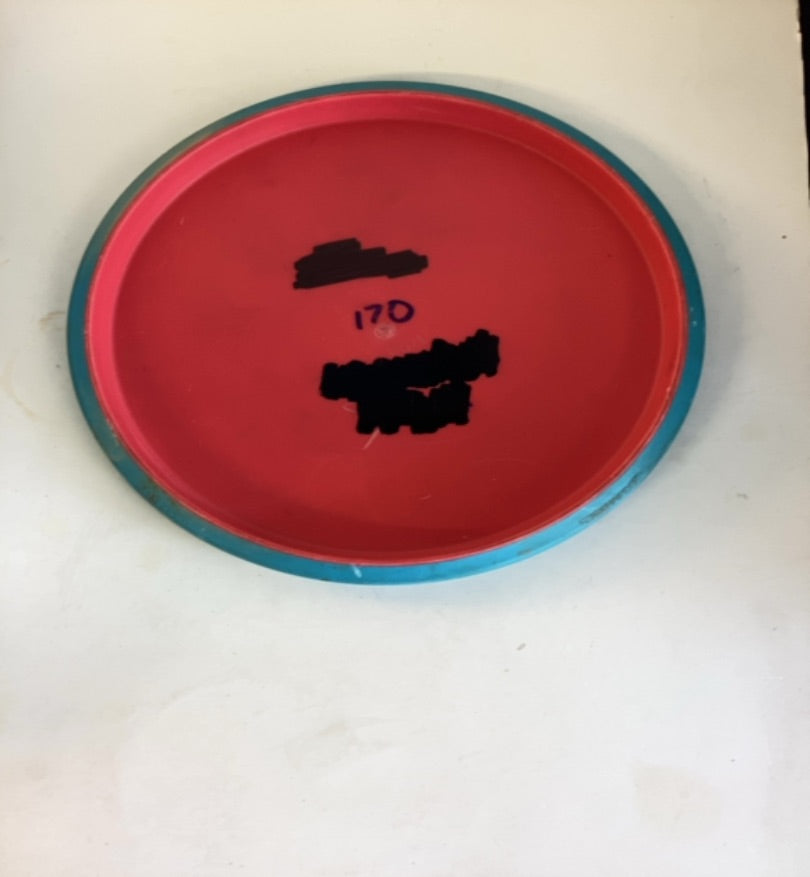 This disc shows significant wear consistent with regular use, including light scuffs on the flight plate and minor rim marks. The bottom has heavy marker ink — including a blacked-out name at the top, a weight notation, and a blacked-out text block below. No ink is present on the front of the disc. The disc is structurally sound with no cracks or significant rim damage. The heavy ink on the bottom has been factored into the condition grade.