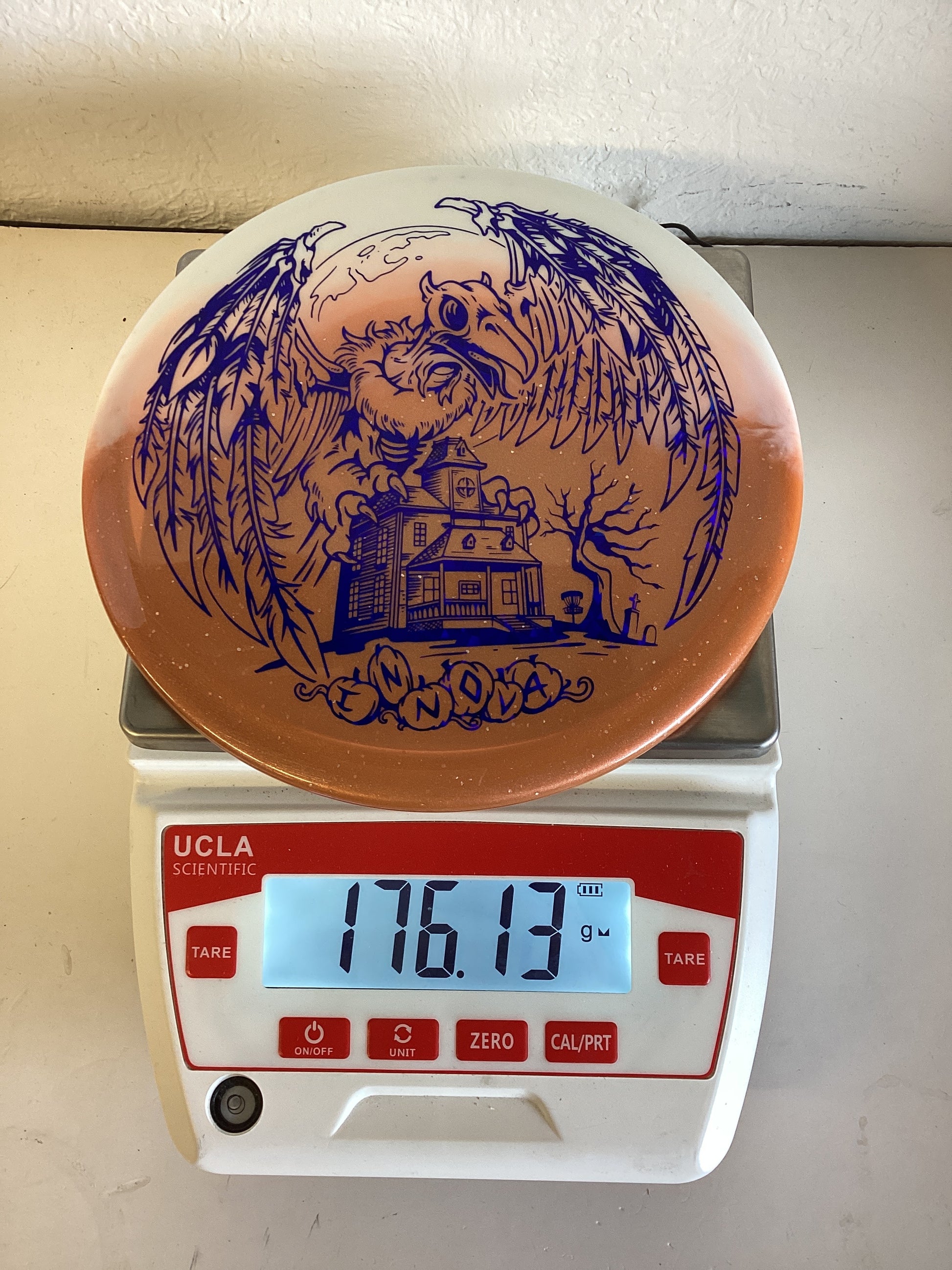 This Roc3 features "Duo", Innova's newest molding process. Every disc is a unique blend of white Star and orange Metalflake materials forming one hauntingly beautiful disc. Then, you add the scary-oversized XXL Halloween Roc stamp and now you have a treat for collectors and players.